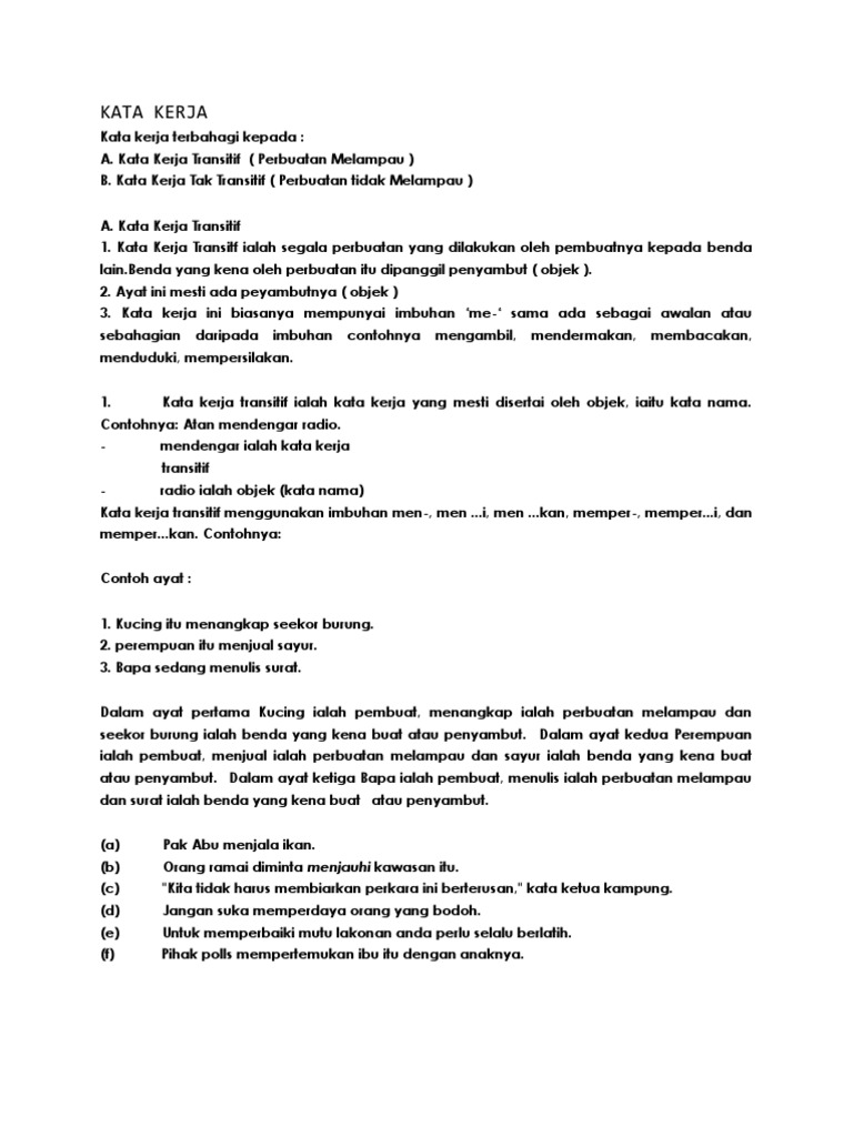 Kata Kerja from imgv2-2-f.scribdassets.com Alhamdulillah (bahasa arab) nah, itulah sebabnya saya berhenti kerja di sana! Kata kerja tak transitif (intransitif) ialah kata kerja yang sudah sempurna maknanya dan dapat berdiri sendiri dalam ayat. Kerjakan latihan soal di bawah ini dan jika ada pertanyaan, silakan tuliskan pada kolom komentar. (kata kerja rehat jelas menunjukkan perbuatan ayah tidak memerlukan objek sebagai pelengkapnya) terdapat beberapa. Contoh kalimat diatas pun menunjukkan bahwa kata kerja menyiram membutuhkan obyek yaitu bunga yang menyertai kata kerja. Perbezaan di antara pelengkap dengan objek atau penyambut ialah pelengkap hadir selepas kata kerja tak transitif untuk menyempurnakan maksud ayat manakala objek atau penyambut hanya hadir selepas kata kerja. Dalam menguasai bahasa inggris tentu hal ini sangat penting, apabila kata kerja dijadikan sebagai kata benda dalam sebuah kalimat tentulah memiliki arti berbeda. Penting sekali bagi penjual untuk mengetahui dengan baik keunggulan barang yang dipasarkannya.