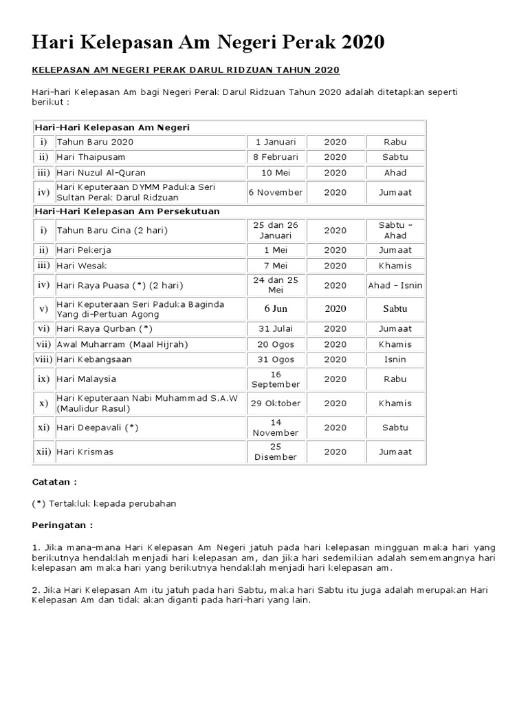 Hari Kelepasan Am Negeri Perak 2020 from imgv2-2-f.scribdassets.com Panduan buat pekerja kerajaan atau swasta dan ibu bapa yang ada perancangan untuk pergi bercuti, planning perjalanan atau mengadakan majlis keraian. Jadual cuti umum kelantan 2020 hari kelepasan am |bilakah tarikh cuti umum negeri kelantan bagi tahun 2020? Kalendar percutian cuti umum terengganu 2020, malaysia mendedahkan semua orang awam, rasmi, persekutuan, bank & kerajaan cuti tahun. Senarai tarikh hari kelepasan am negeri perak 2020. *hari raya aidilfitri *hari raya aidilfitri (hari kedua). Hari kelepasan am malaysia tahun 2020. Hari kelepasan am tahun 2020. Perhatian buat warga kelantan yang ingin mengetahui jadual cuti umum dan cuti sekolah negeri kelantan darul naim tahun 2020.