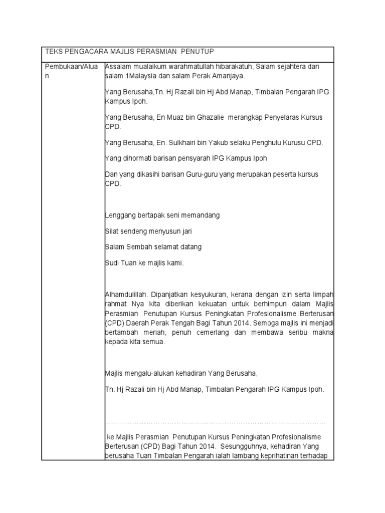 Contoh teks ucapan pengacara majlis. Assalamualaikum w.r.b.t dan selamat pagi. Teks ucapandatuk haji hajiji haji noor,menteri kerajaan tempatan dan perumahan sempena meraikan majlisperpisahan puan p.s. Kini tibalah masa , untuk kita mendengar amanat dan ucapan yang. Dalam majlis jasamu di kenang ini, saya ingin merakamkan ucapan terima kasih khusus kepada puan p.swong yang akan bersara didalam beberapa hari lagi diatas jasa dan khidmat bakti yangdicurahkan sepanjang berada.